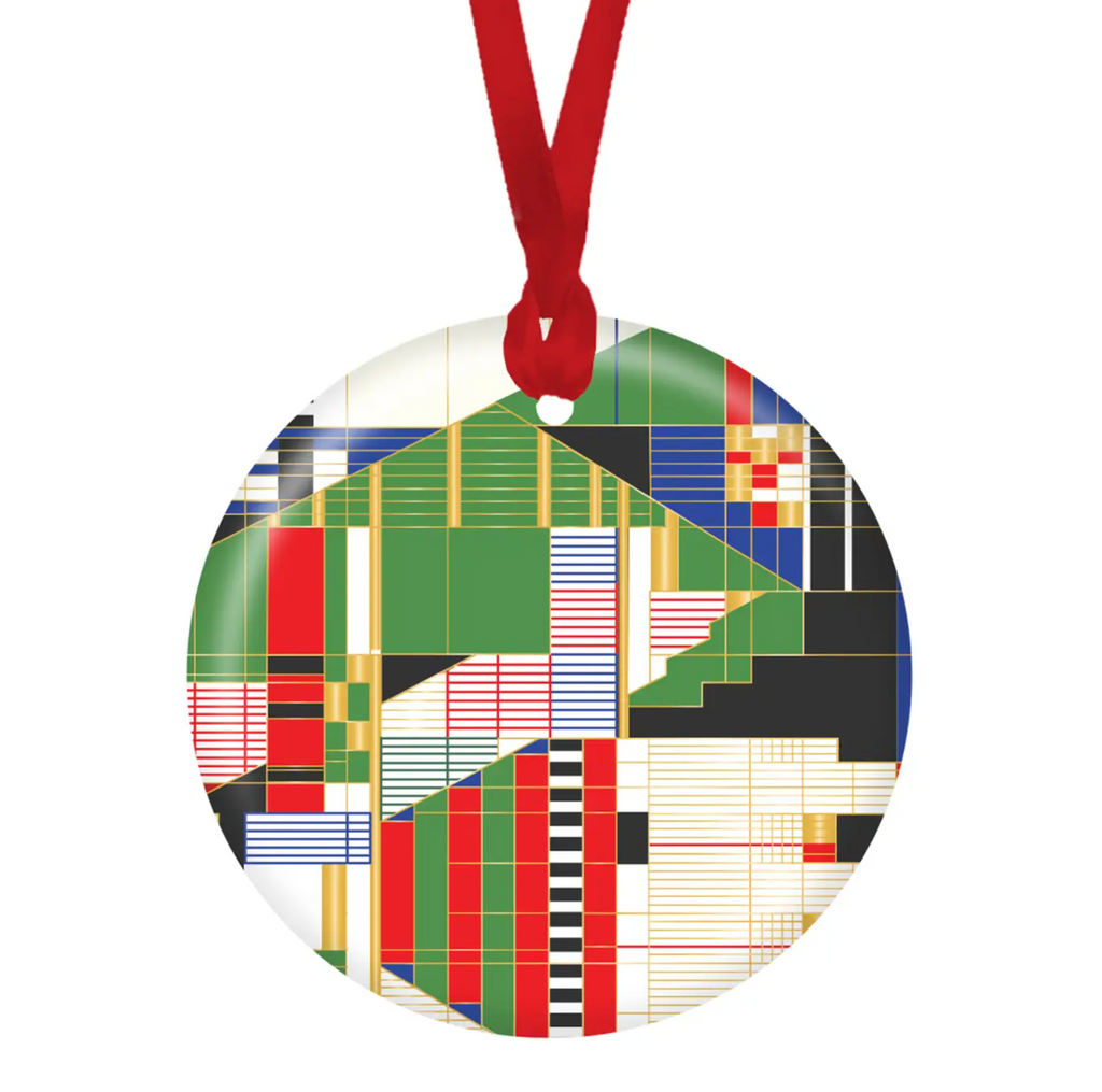 This ornament features Frank Lloyd Wright's Hillside Curtain design.