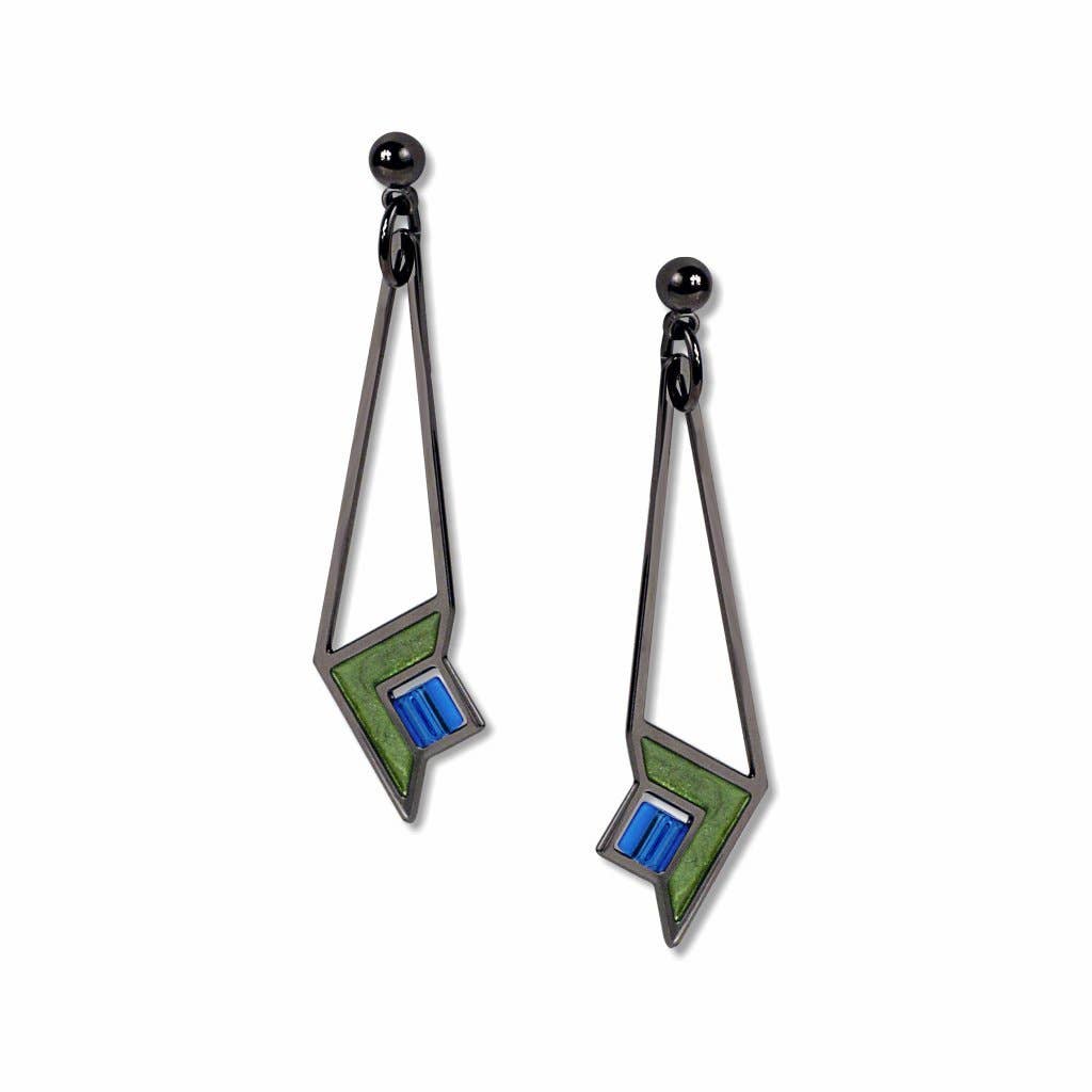 An art glass panel in the Susan Lawrence Dana House inspired these earrings. The stained glass has a combination of 60 and 90-degree angles. The result is unusual and highly decorative and very characteristic of Frank Lloyd Wright inventive powers.