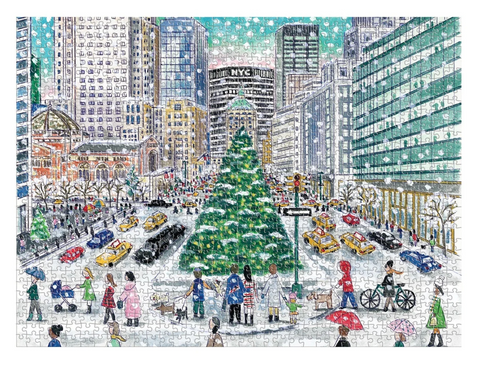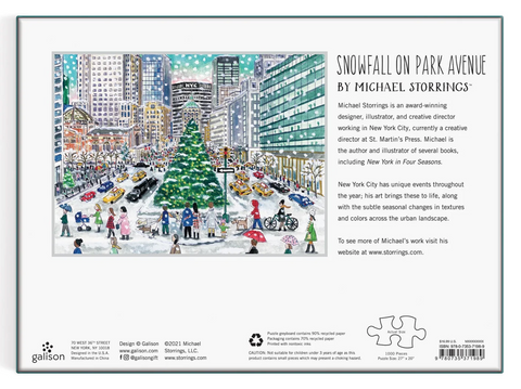Award-winning designer, illustrator, and creative director Michael Storrings highlights the ultimate winter experience in New York City featuring snow, a lit Christmas tree and holiday shoppers in Michael Storrings Snowfall on Park Avenue 1000 Piece Puzzle. Galison puzzles are packaged in matte-finish sturdy boxes, perfect for gifting, reuse, and storage. An insert of the full puzzle image is also included.