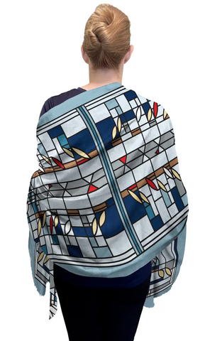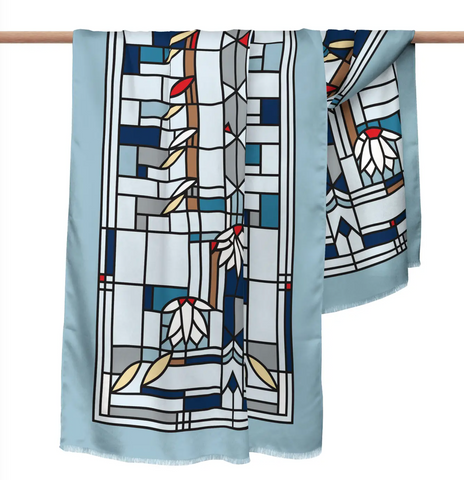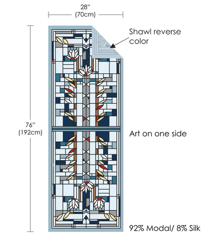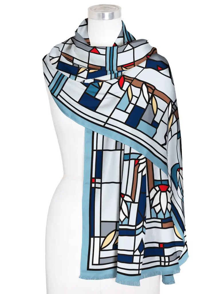 Embrace color, comfort and style in a spectacular Fine Art silk blend shawl designed to wear as a wrap or scarf. This shaw is inspired by Frank Lloyd Wright's Waterlilies drawing.
