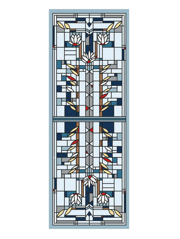 Frank Lloyd Wright's Waterlilies is thought to be designed for an art glass screen around 1893-1895, but was never produced. The window features an intricate pattern of abstracted lily pads and flowers rendered in a cool color palette of blues, whites, and pops of yellows. The organic forms and repeating motifs of this early design reflect Wright's commitment to integrating nature into his architectural work. Waterlilies remains a celebrated example of Wright's innovative approach to design and architecture.