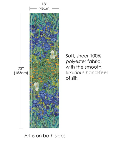 Embrace color, comfort and style in our Fine Art Sheer Scarves designed to wear as a wrap or scarf. This wearable work of art is inspired by Vincent Van Gogh's famous painting "Irises", currently on view at the Getty Museum in Los Angeles, California.